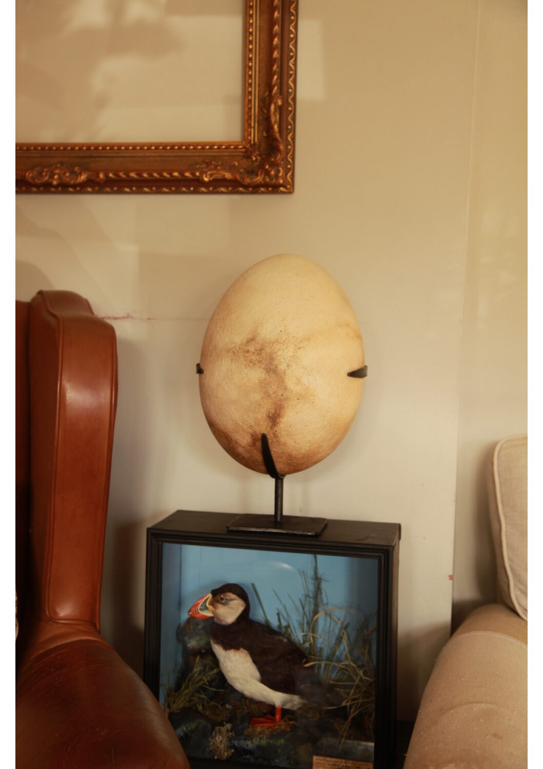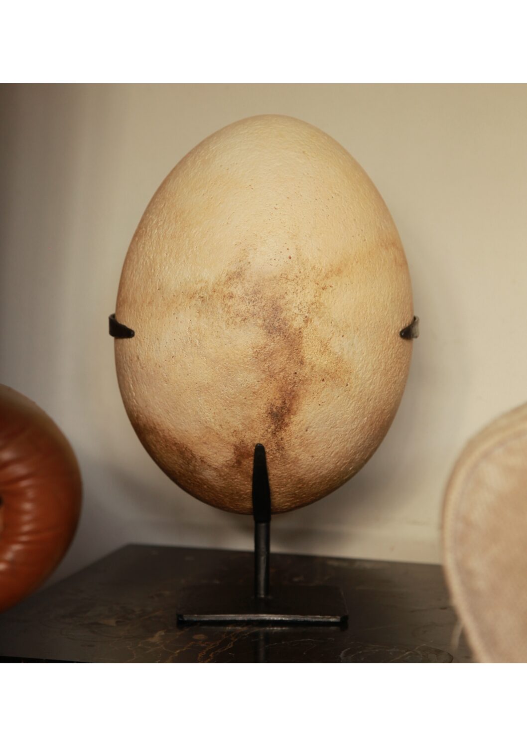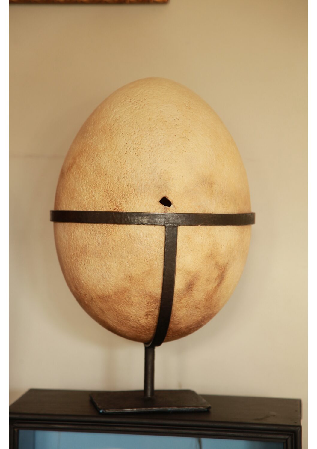The egg of “Aepyornis maximus” The Elephant Bird is a truly magnificent marvel of nature. The largest egg ever to be laid by a bird hails from Madagascar and was laid by a flightless now extinct gigantic species. This huge upright bird stood over 3m tall! Elephant Birds were only ever found on the island of Madagascar where the beaches still to this day are strewn with millions of egg shell fragments measuring from 10-100mm across and 3-4mm thick. Replicating this mammoth of an egg was a real engineering challenge, as the huge hollow cast needed to be correct in exact dimension height through to circumference, with such a large void it was very difficult to cast without it collapsing under its own weight. This replica is the perfect weight and even features a large blow hole to the rear. To display this mesmerising piece made much more popular by Sir David Attenborough’s recent documentary, Tony has devised a hand-forged iron stand, which gently cradles the huge egg without distracting from the overall egg shaped form. This makes a stunning interior statement piece! – a recent client complained… “I have a problem with my Elephant Bird Egg! it is located on a shelf in close proximity to my television screen. I now find myself listening to the background commentary but am totally transfixed by my giant aquisition and can’t stop staring at its over powering presence!”